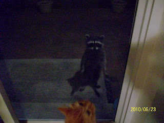 I went upstairs and got the older kids, who were still very much awake, to show them our visitor. The raccoon stayed around for quite a while even though 6 people were looking at him and we kept taking pictures. None of the pictures turned out very well through the screen so I had to do a little photo editing. It was pretty neat but now I am worried about my tomatoes when they start growing later this summer. Keith looked it up online and it says raccoons will eat tomatoes. Maybe he will give up and find a new friend!